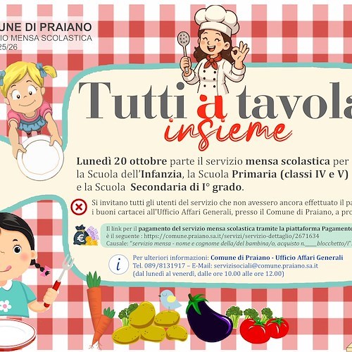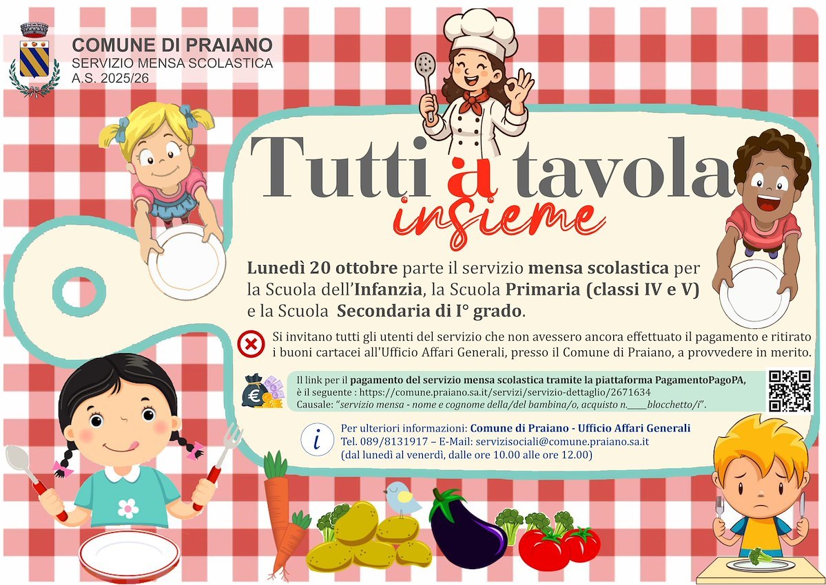 A partire da lunedì 20 ottobre 2025, nel Comune di Praiano prenderà ufficialmente il via il servizio di mensa scolastica per gli alunni della Scuola dell’Infanzia, della Scuola Primaria (classi IV e V) e della Scuola Secondaria di I° grado.