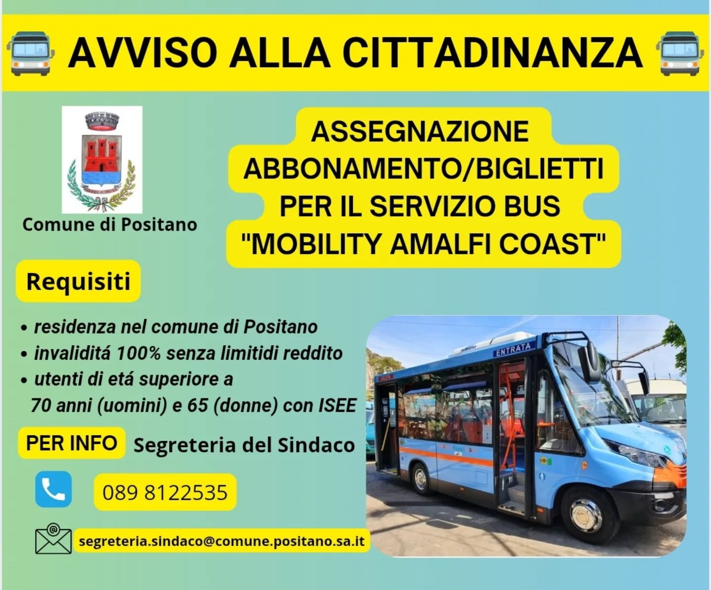 L’Amministrazione Comunale di Positano rinnova anche per quest’anno il servizio gratuito di trasporto urbano dedicato agli anziani meno abbienti e agli invalidi civili al 100%, attraverso la concessione di abbonamenti nominativi per il bus di linea interna "Mobility Amalfi Coast".