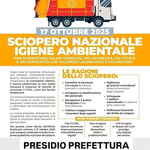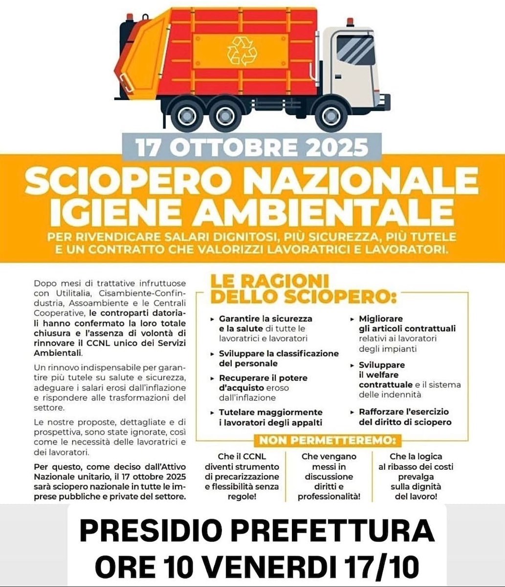 Venerdì 17 ottobre 2025 i lavoratori dell'igiene ambientale incroceranno le braccia per lo sciopero nazionale del settore. Anche a Salerno si terrà un presidio davanti alla Prefettura, in programma alle ore 10, promosso dalla FIT-CISL provinciale.