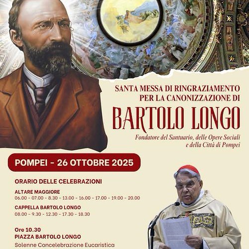 Il Pontificio Santuario della Beata Vergine del Rosario di Pompei si prepara a vivere una giornata di grazia e di gioia. Domenica 26 ottobre, alle ore 10.30, in Piazza Bartolo Longo, sul sagrato della Basilica mariana, si terrà la Santa Messa di ringraziamento per la canonizzazione di San Bartolo Longo, fondatore del Santuario e della Nuova Pompei.