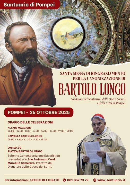 Beatificato da Giovanni Paolo II nel 1980, Bartolo Longo è stato canonizzato il 19 ottobre 2025 da Papa Leone XIV, dopo l'approvazione di Papa Francesco lo scorso febbraio.