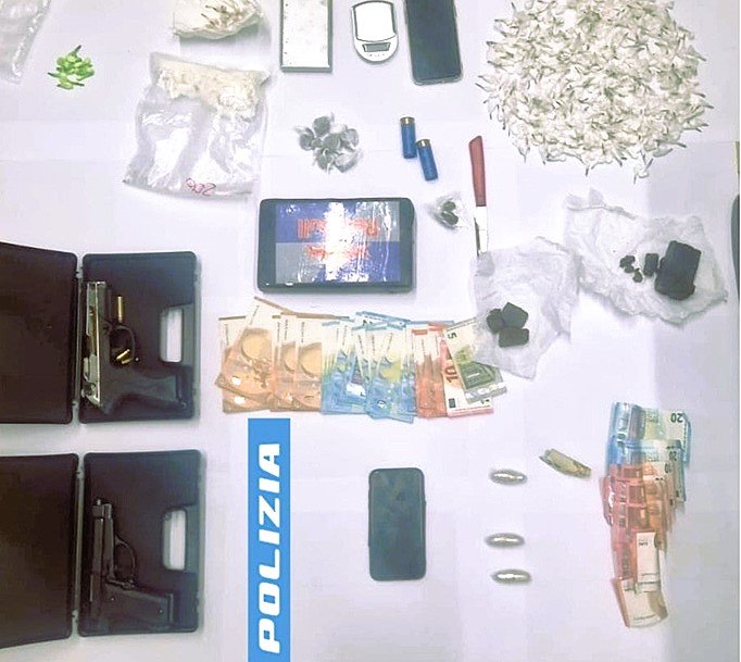 Durante la perquisizione domiciliare, la Polizia ha rinvenuto un'ingente quantità di sostanze stupefacenti e materiale per il confezionamento: circa 1,3 chilogrammi di cocaina, parte della quale già suddivisa in oltre 400 dosi pronte per la vendita, 4 grammi di eroina confezionata, 180 grammi di hashish, oltre a due pistole scacciacani, di cui una modificata per essere utilizzata come arma da fuoco, con una cartuccia calibro 9 in canna.