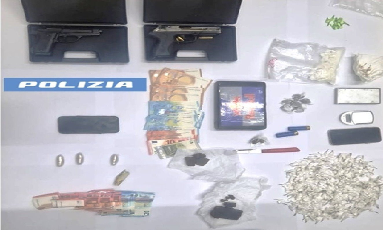All'esito del servizio di osservazione, è stata effettuata la perquisizione domiciliare, nel corso della quale è stato rinvenuto materiale per il peso e il confezionamento, nonché una ingente quantità di sostanze stupefacenti: 1,3 Kg circa di cocaina, di cui una parte confezionata in oltre 400 dosi pronte per lo spaccio; 4 gr circa di eroina, già confezionata in dosi; 180 gr circa di hashish e 2 pistole scacciacani, una delle quali modificata per renderla un'arma da fuoco, con una cartuccia calibro 9 in canna.