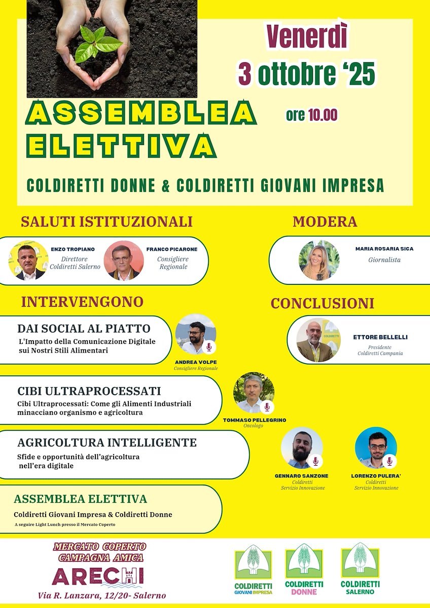 Giornata di elezioni per "Coldiretti Giovani Impresa" e "Coldiretti Donne" di Salerno. Il rinnovo delle cariche associative è in programma domani (venerdì 3 ottobre 2025) nel corso di una intensa mattinata di lavori ospitata dal Mercato Coperto Arechi di via Lanzara a Salerno. Ad aprire i lavori i saluti istituzionali affidati al padrone di casa Vincenzo Tropiano direttore di Coldiretti Salerno. Il suo messaggio di benvenuto precede quello istituzionale del consigliere regionale Franco Picarone.