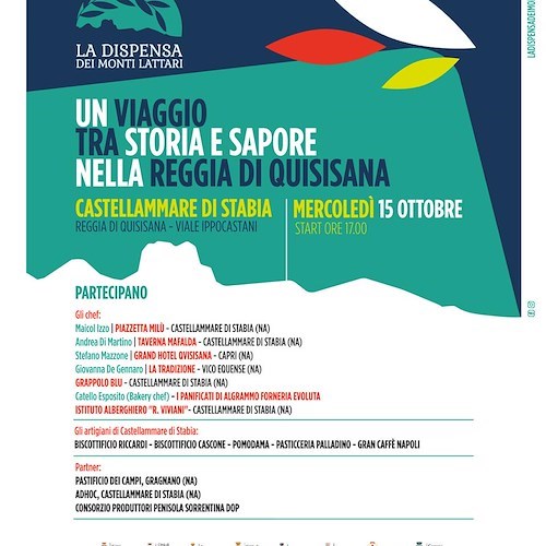Dalle 19, la Reggia si trasformerà in un laboratorio del gusto con un itinerario culinario in cinque tappe, pensato come un viaggio sensoriale tra tradizione, condivisione e creatività. Chef stellati, maestri artigiani e giovani talenti dell'Istituto Alberghiero Viviani proporranno piatti simbolo del territorio, reinterpretazioni innovative e dolci iconici della pasticceria stabiese. Dalle eccellenze casearie e panificate ai primi piatti della memoria, fino a creazioni contemporanee e dessert d'autore, ogni assaggio racconterà una storia diversa, legata ai Monti Lattari e alle loro radici.