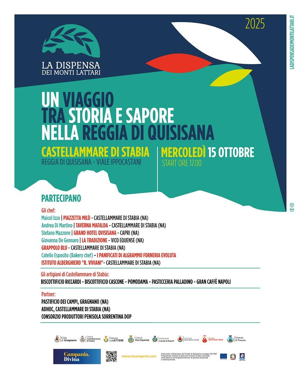 Mercoledì 15 ottobre 2025, la rassegna La Dispensa dei Monti Lattari fa tappa a Castellammare di Stabia nella cornice della Reggia di Quisisana con un pomeriggio che intreccia cultura, memoria, gastronomia e valorizzazione del territorio. La residenza borbonica, simbolo di storia e bellezza, diventerà teatro di un vero e proprio percorso esperienziale. Si comincerà alle ore 17 con una tavola rotonda che vedrà protagonisti autorevoli giornalisti, direttori museali e chef di rilievo nazionale.