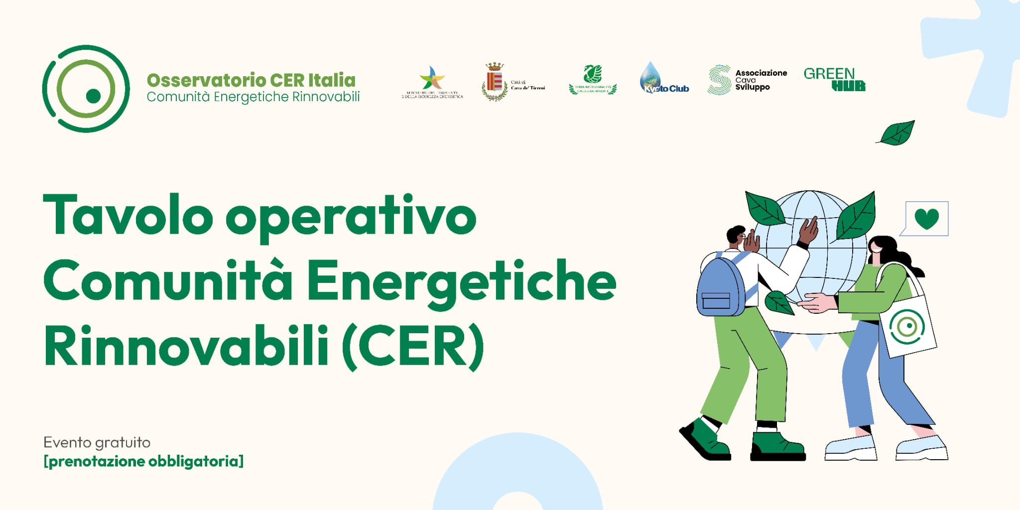 Si terrà il 28 ottobre prossimo, dalle ore 17 alle 19, presso il Green Hub (Via Carmine Consalvo 38, frazione di San Pietro) il Tavolo Operativo sulle Comunità Energetiche Rinnovabili (CER), promosso da Osservatorio CER Italia, in collaborazione con Legambiente - Terra Metelliana e con il patrocinio del Ministero dell'Ambiente e della Sicurezza Energetica (MASE), del Comune di Cava de' Tirreni, di Kyoto Club e dell'associazione Cava Sviluppo.
