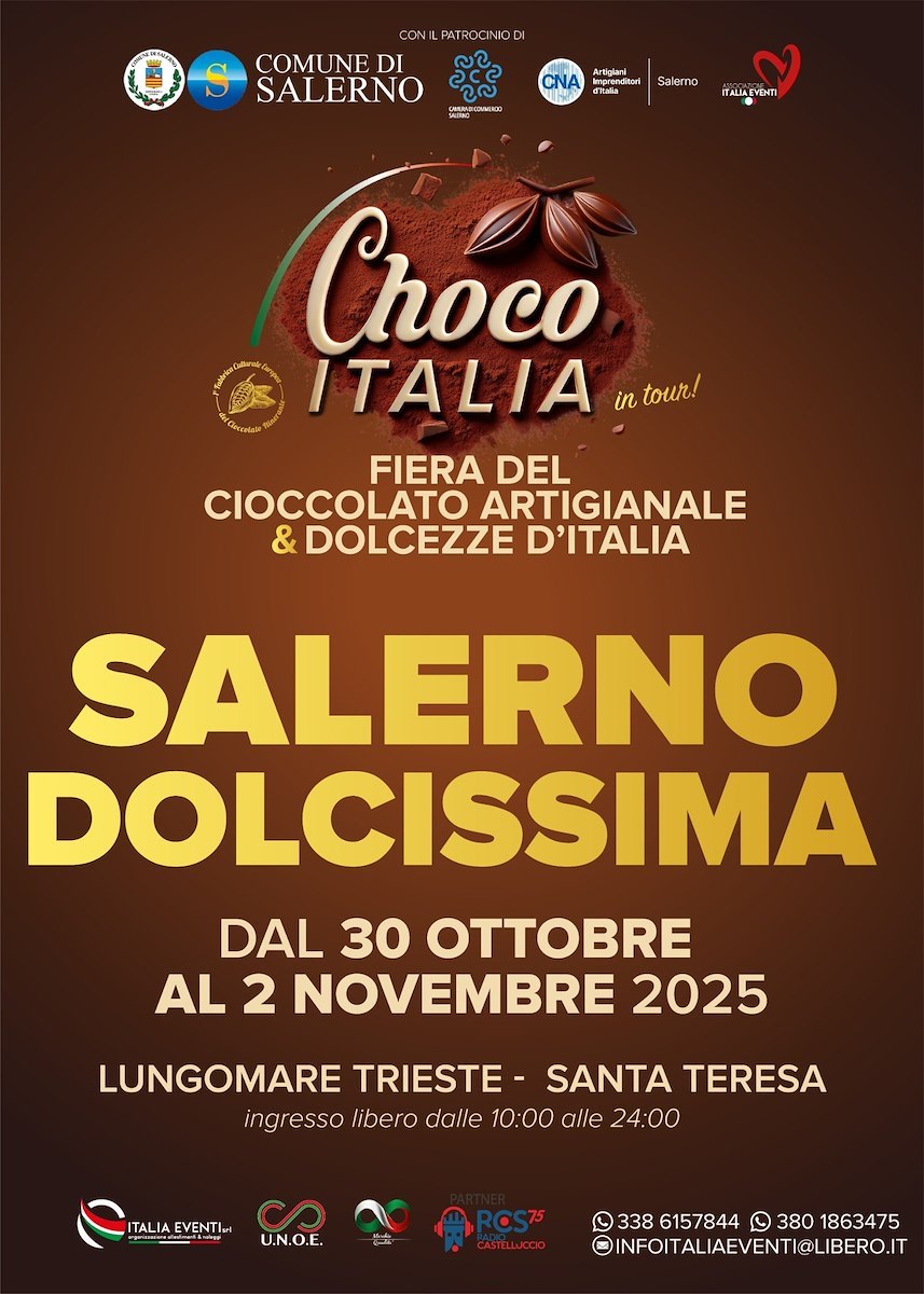 SalernoDolcissimaè promossa dalla CNA Salerno, organizzata e realizzata dall'Associazione Italia Eventi, con il patrocinio del Comune di Salerno, dellaCamera di Commercio di Salerno, dell'UNOEUnione Nazionale Organizzatori di Eventi e dell'Associazione The Chocolate Way. L'inaugurazione ufficiale, a cui prenderanno parte le istituzioni e le autorità, si svolgeràvenerdì 31 ottobre, alle ore 11.