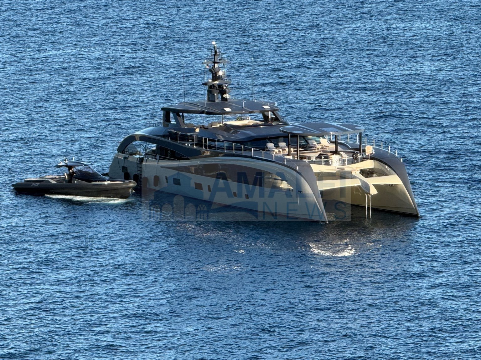 Nel pacato tramonto autunnale, la linea dell’orizzonte marino si anima con un’altra presenza d’eccezione: il SEAWOLF X, imponente catamarano di lusso lungo circa 43 metri, è in rada a poca distanza dalla costa di Marmorata, equipaggiato con un elegante tender d’appoggio che pulsa quasi da protagonista. Le sue due fiancate gemelle rendono la nave riconoscibile, quasi scolpita nell’acqua, mentre il tender assicura mobilità e stile ai suoi ospiti.