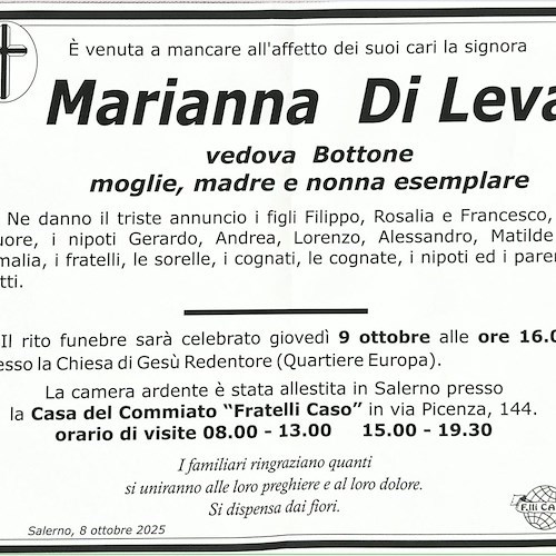 Si è spenta all'età di 68 anni la signora Marianna Di Leva, vedova Bottone, moglie, madre e nonna esemplare.