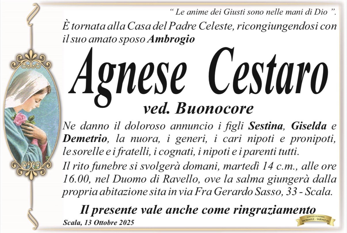 È tornata alla Casa del Padre Celeste, all'età di 91 anni, Agnese Cestaro, vedova Buonocore, nata a Ravello e residente a Scala. Con la sua scomparsa, la comunità perde una donna stimata e profondamente legata ai valori della famiglia e della fede.