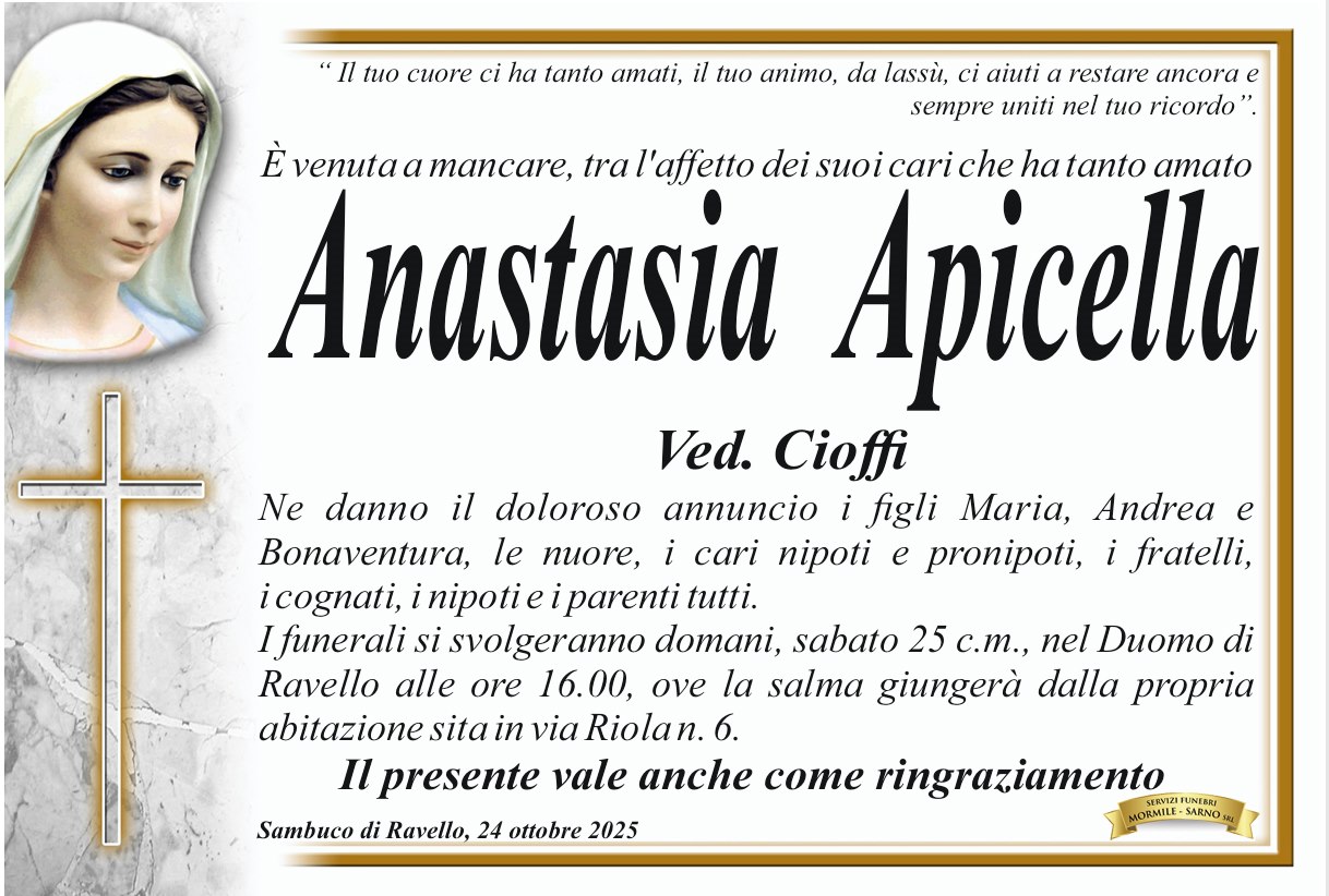 Si è spenta serenamente, circondata dall'amore dei suoi familiari, Anastasia Apicella, vedova Cioffi. Nata a Tramonti nel 1937 risiedeva nella frazione di Sambuco di Ravello.