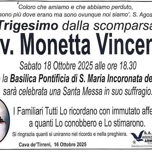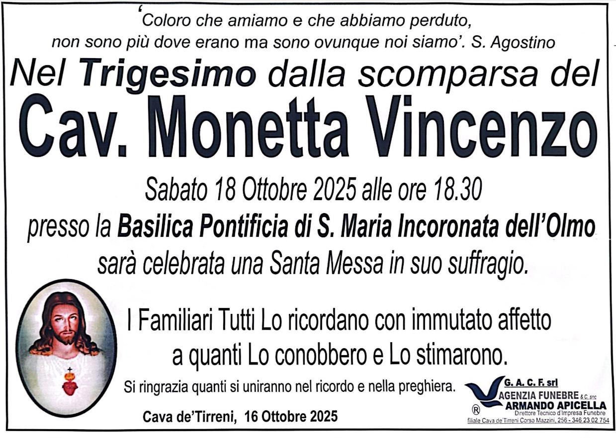 «Coloro che amiamo e che abbiamo perduto, non sono più dove erano ma sono ovunque noi siamo». Con queste parole di Sant'Agostino, la famiglia Monetta ricorda con profondo affetto il Cavaliere Vincenzo Monetta, nel Trigesimo dalla sua scomparsa.