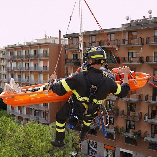 Le operazioni simulate hanno previsto la ricerca e il recupero di persone intrappolate sotto le macerie e il salvataggio di un ferito dal tetto di un edificio tramite autoscala e barella, con consegna ai sanitari del 118 per il trasporto in sicurezza.