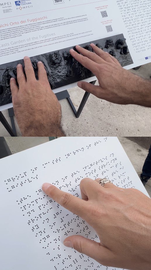 Pompei si esplora con tutti i sensi. Il Parco archeologico di Pompei amplia i servizi di accessibilità per un'esperienza di visita più coinvolgente per tutti. Un supporto tattile che racconta la storia di Pompei, posto all'ingresso di Piazza Anfiteatro, introduce al percorso. Supporti tattili con bassorilievi ad alta definizione corredati da didascalie in Braille, modelli 3D e QR code, che rimandano ad audio descrizioni e video in LIS, sono ora disponibili in diversi luoghi del sito. Una mappa progettata graficamente e linguisticamente per la lettura non visiva e una mappa concettuale, con i modelli dei luoghi più iconici riprodotti in 3D, favoriscono l'orientamento per una visita in piena autonomia.