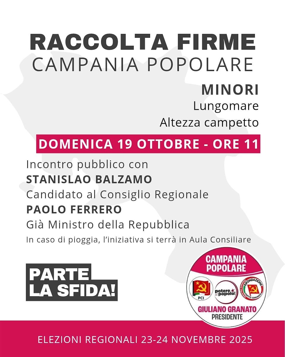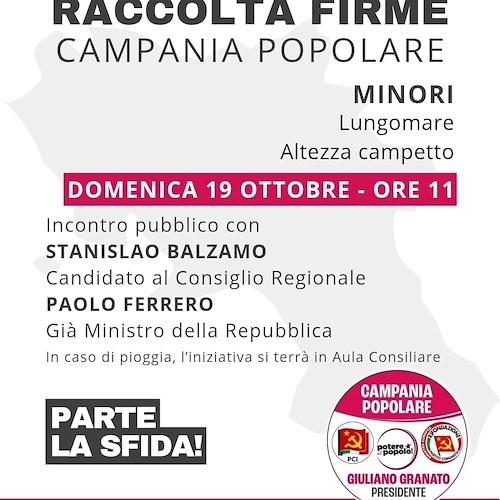 Si terrà domenica 19 ottobre alle ore 11, sul lungomare di Minori (altezza campetto), l'incontro pubblico promosso dal comitato locale della coalizione Campania Popolare, in occasione dell'avvio della raccolta firme necessaria alla presentazione della lista per le elezioni regionali del 23 e 24 novembre 2025.