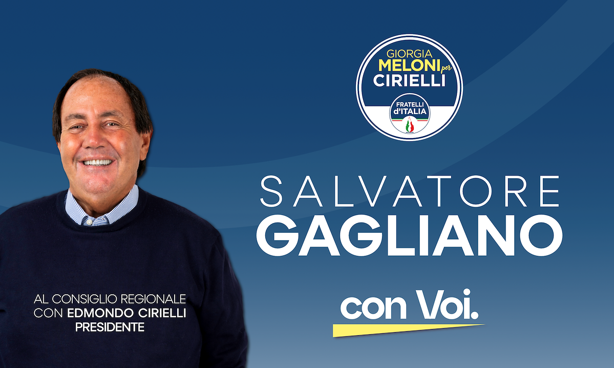 Si terrà sabato 25 ottobre 2025, alle ore 11.00, presso il Salone Moka in Corso Vittorio Emanuele n. 108 a Salerno, la presentazione ufficiale della candidatura di Salvatore Gagliano al Consiglio Regionale della Campania, nella lista di Fratelli d'Italia con Edmondo Cirielli candidato presidente.