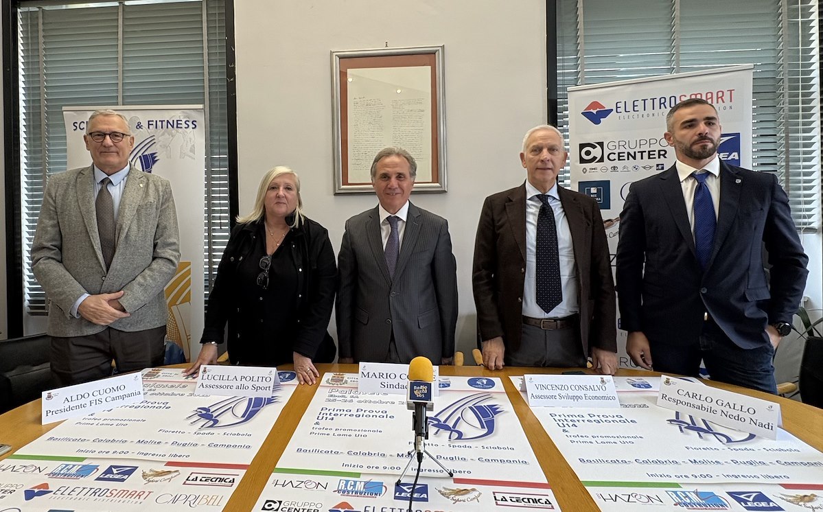 EBOLI - È stata presentata questa mattina presso il Municipio di Eboli la Prima Prova Interregionale Under 14 che si terrà al PalaSele sabato 25 e domenica 26 ottobre. Più di 500 atleti provenienti da Campania, Puglia, Molise, Calabria e Basilicata calcheranno le pedane ebolitane per l'evento dedicato alle categorie del Gran Premio Giovanissimi, in quella che è la tappa iniziale del percorso che condurrà al 62° "Trofeo Renzo Nostini - Kinder Joy of Moving", in programma nel mese di maggio a Riccione, dove saranno assegnati i titoli italiani 2026. A margine dell'evento, al PalaSele, si svolgerà anche la gara promozionale dedicata agli schermidori under 10 Esordienti e Prime Lame.