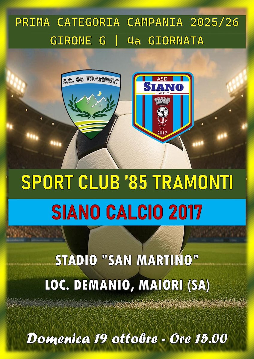 Cresce l'attesa per la quarta giornata del campionato di Prima Categoria - Girone G. Domenica 19 ottobre 2025, alle ore 15:00, allo stadio "San Martino" (località Demanio di Maiori), lo Sport Club '85 Tramonti ospiterà il Siano Calcio 2017 per una sfida che si preannuncia ad alta intensità.