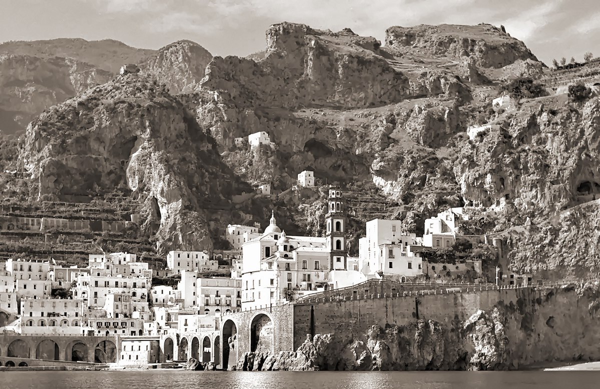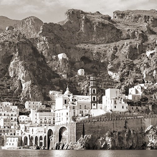 Il paesaggio di Atrani immortalato nel 1950 da Konrad Helbig, condiviso sulla pagina social di Giovanni Forgione, mostra un volto sorprendentemente diverso da quello odierno. Le case bianche del borgo, adagiate sul mare, sembrano identiche a quelle di oggi, ma ciò che colpisce è la totale assenza di vegetazione sul Monte Aureo, la montagna che separa Atrani da Scala. Le rocce nude e aspre dominano la scena, in netto contrasto con il verde rigoglioso che oggi ricopre le alture.
